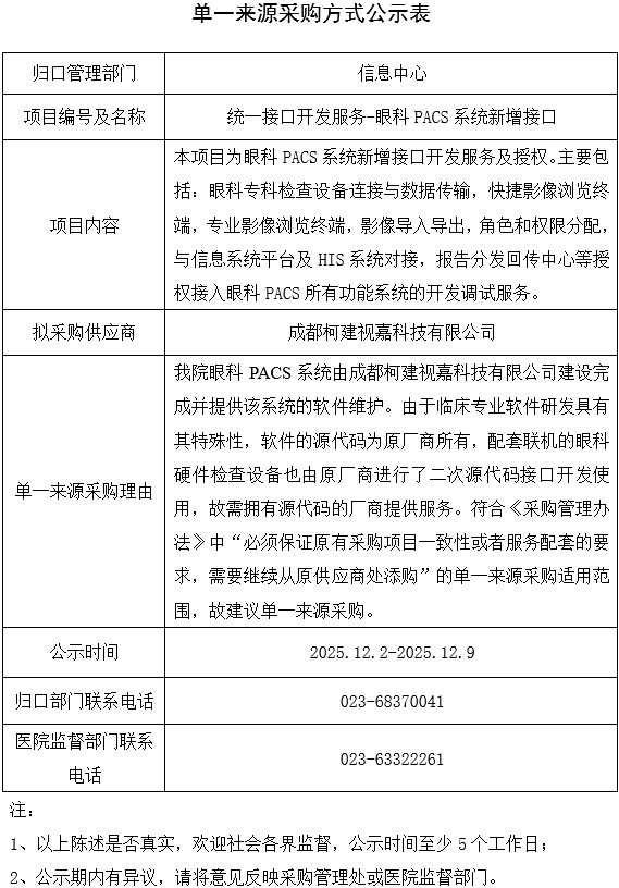 统一接口开发服务-眼科PACS系统新增接口单一来源采购方式公示
