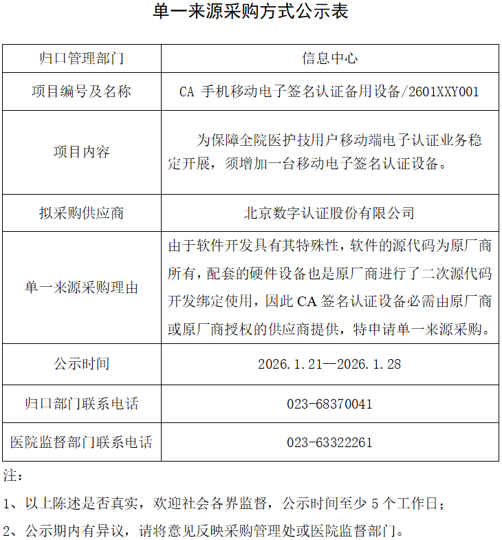 CA 手机移动电子签名认证备用设备单一来源采购方式公示