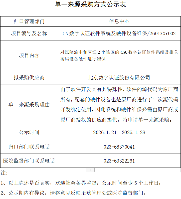 CA数字认证软件系统及硬件设备维保单一来源采购方式公示