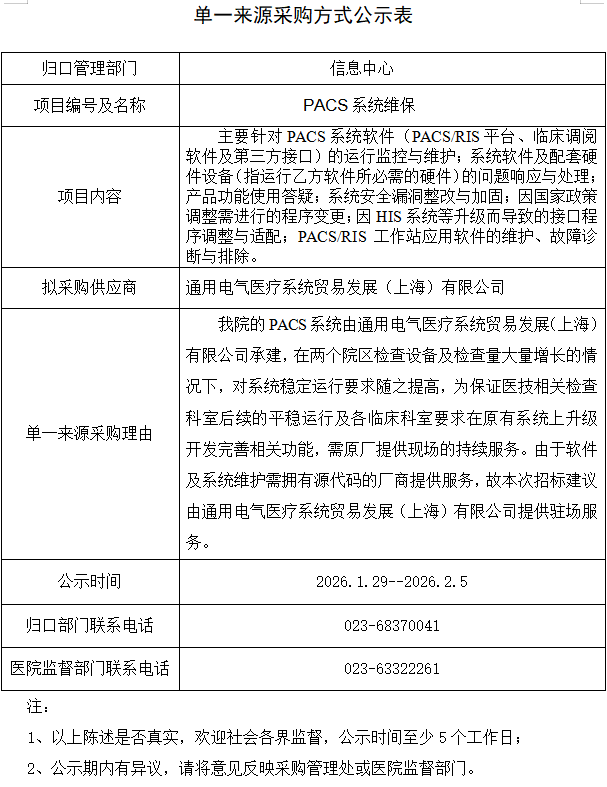 PACS系统维保单一来源采购方式公示